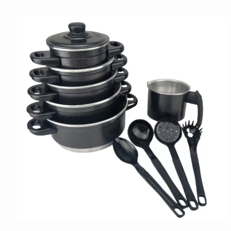 Além das panelas, o kit inclui um conjunto de talheres essenciais, facilitando desde o preparo até o momento de servir.